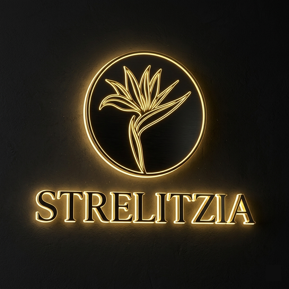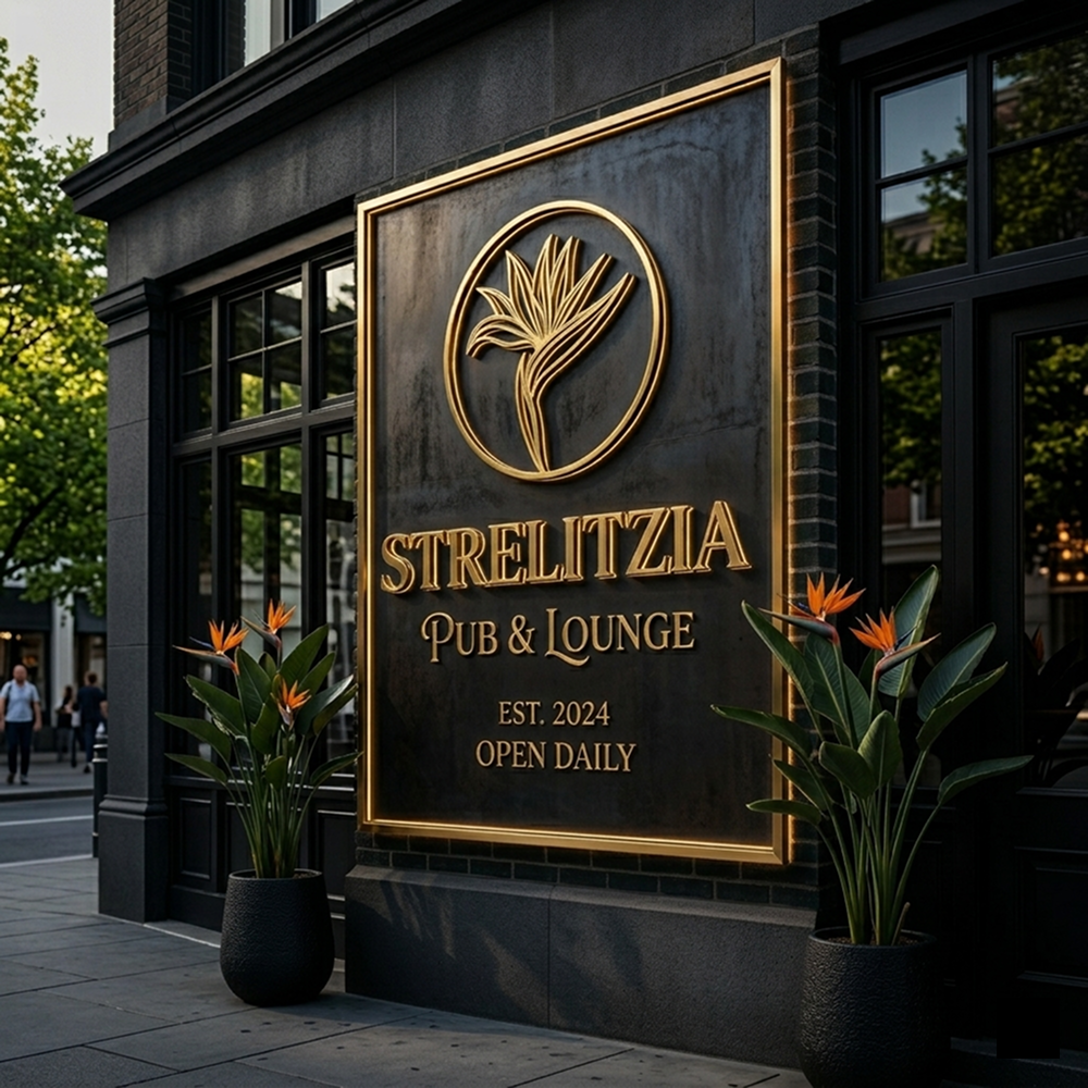 Strelitzia (Bird of Paradise) is naturally wild and colorful. The challenge was to “deconstruct” this organic form into a minimalist geometric emblem. The brand identity needed to evoke the luxury of a premium pub while maintaining the unique DNA of the tropical flower that gives the venue its name.